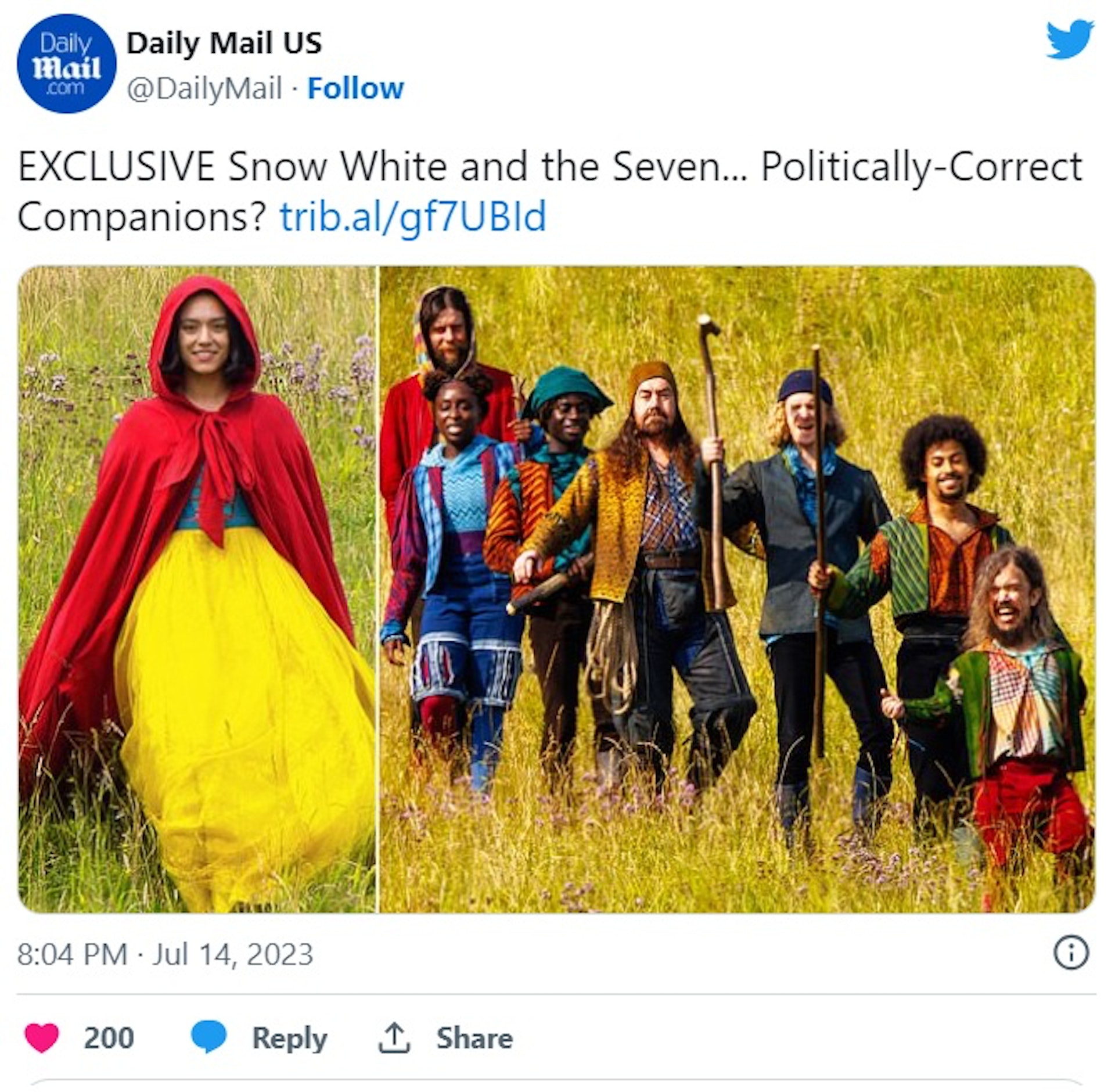 迪士尼近年积极将动画改编成真人版电影,最近《白雪公主》(Snow White)即将于2024年上画,如火如荼地拍摄,网络传出片场照片,可见7名小矮人中,无论是身高、肤色、性别皆走多元的路线,与原著形象大不相同,被外媒评为“白雪公主与政治正确的伙伴”。