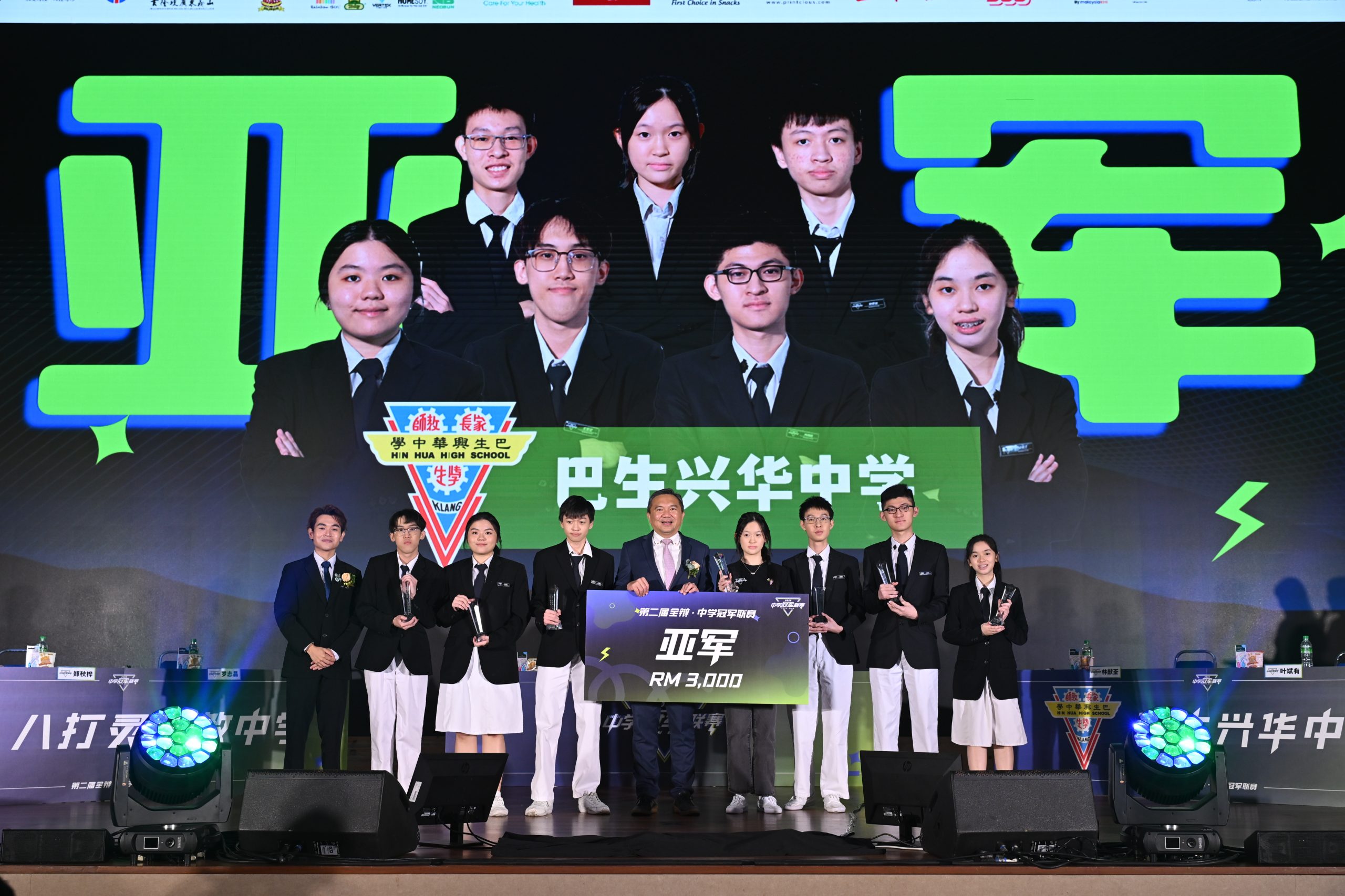 亚军队伍巴生兴华中学辩论队与嘉宾YB黄思汉及筹委会主席陈文焕合影,图中由左二起为王宏正、陈诗琦、邢家诚、YB黄思汉、周凯欣、陈愷轩、黄靖皓、邱紫仪。