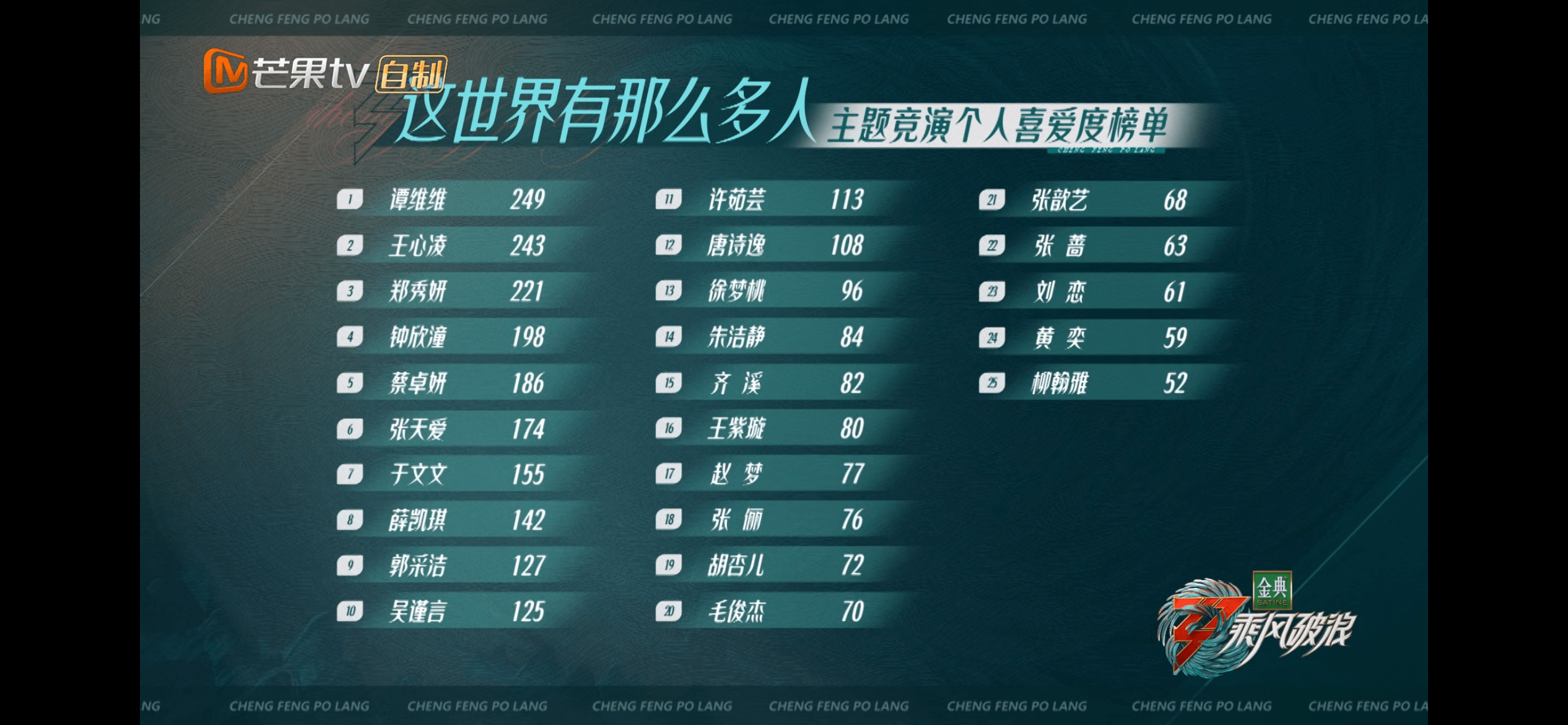 根据节目组公布的个人喜爱度榜单,谭维维、王心凌及郑秀妍名列前三。