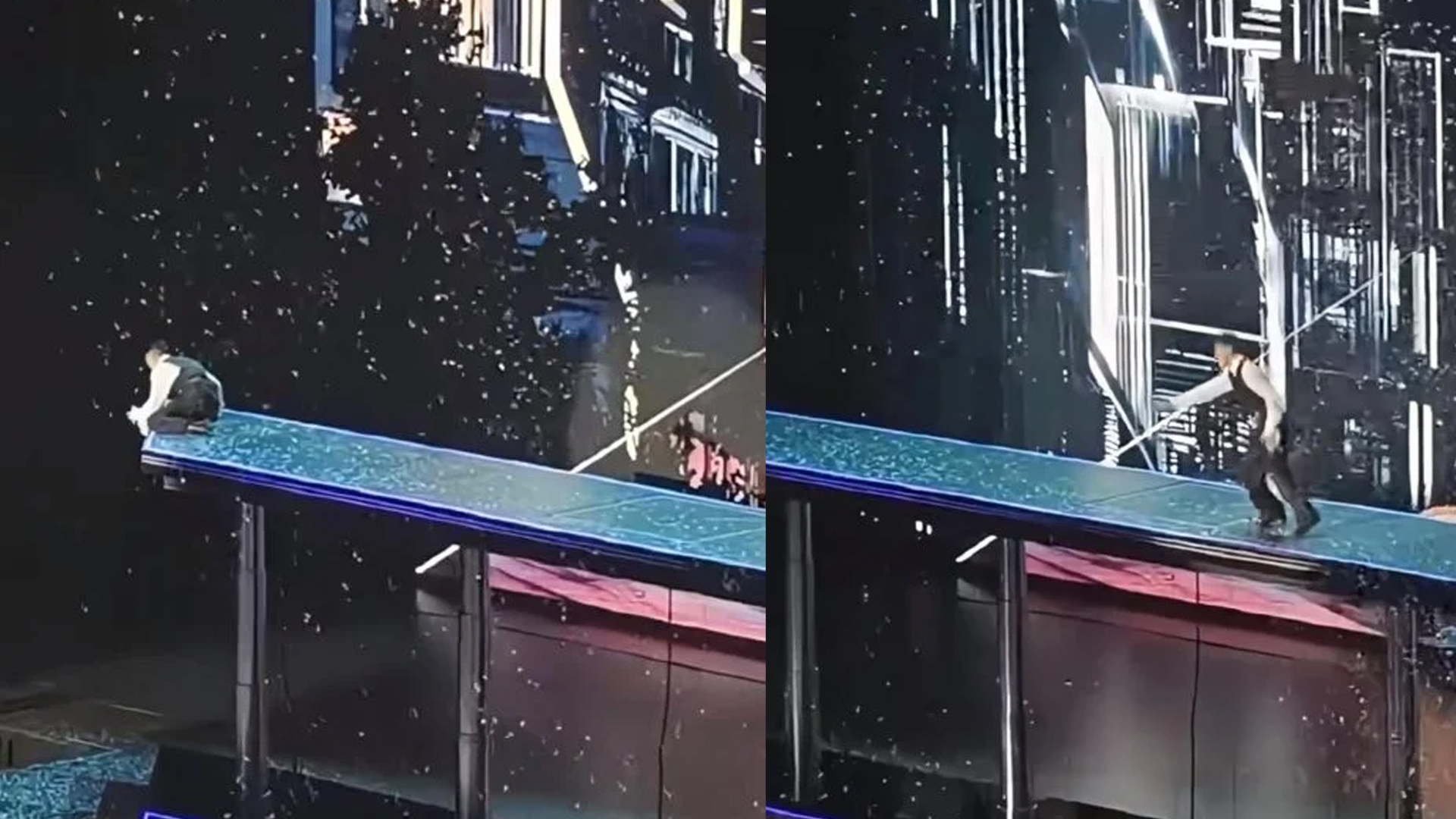 随后他配合歌曲情节,来到上升舞台,并作出一个助跑跪滑的动作,似乎太用力,差点整个人飞出去,有一半膝盖腾空在外面,所幸他用手稳住身体,退回安全位置,之后仍然稳定演唱,表现不受影响。