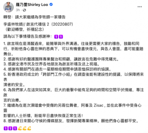 今天阿Mo父亲李盛林牧師发出第二封代祷信,并由家庭发展基金总干事罗乃萱转发,内容透露阿Mo的最新情况。