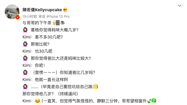 林志颖太太陈若仪在微博发文分享与Kimi一起喝下午茶时的趣味对话,聊起爸妈实际年龄,结果却是挖坑给自己踩!
