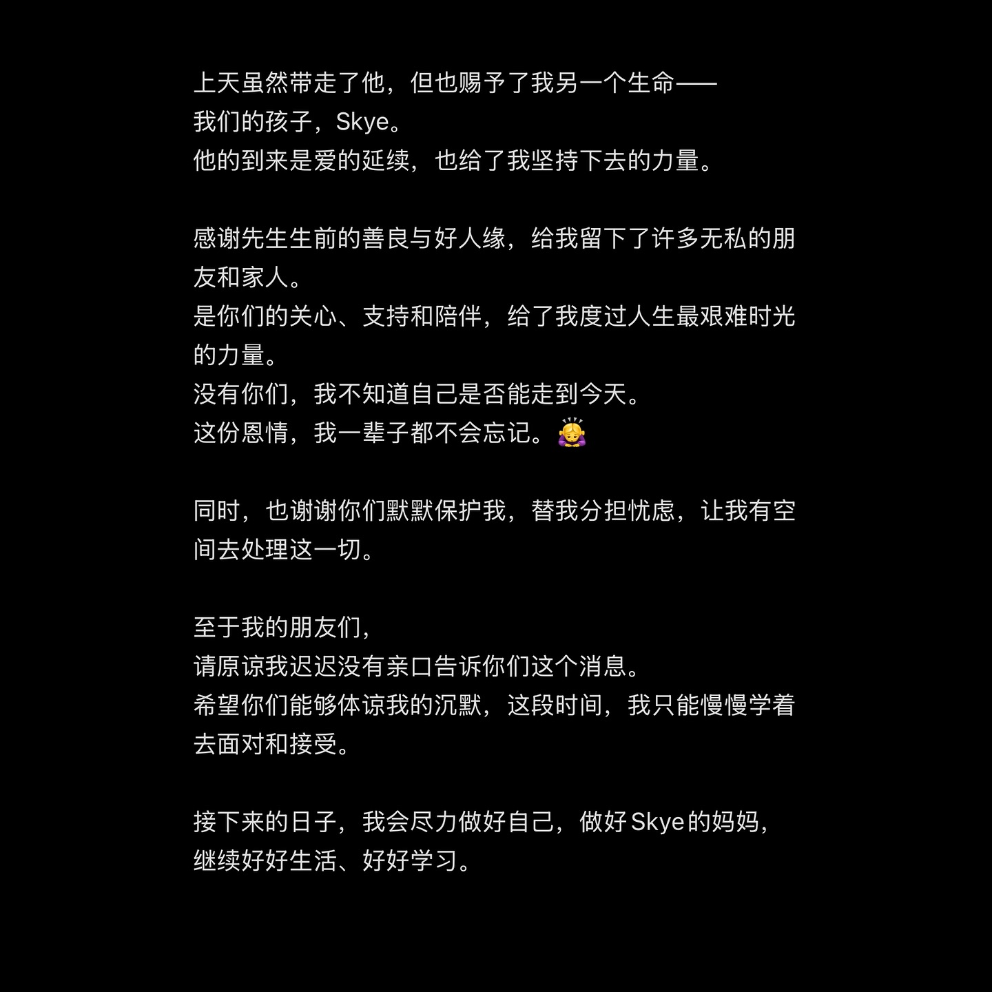 “半年前,我的先生永远地离开了我们。没有病痛,也没有预兆,他的骤然离世让我措手不及。这段时间,我经历了新家装修、生孩子、坐月子、搬家、第一次当妈妈,以及一个人承担养育孩子的责任。”