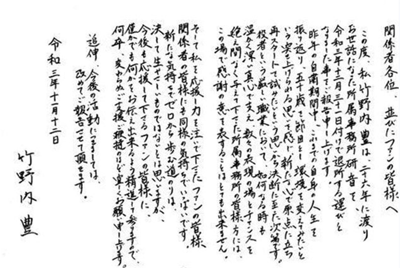 才刚获选“最想拥有脸蛋”男艺人冠军的竹野内丰,在公司的官方网站上发布一封亲笔手写信,宣布离开合作26年的经纪公司“研音”。