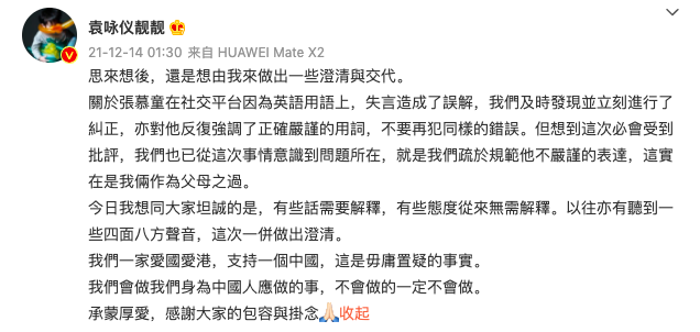 随后,袁咏仪在微博上发文澄清,“思来想后,还是想由我来做出一些澄清与交代。关于张慕童在社交平台因为英语用语上,失言造成了误解,我们及时发现并立刻进行纠正。”