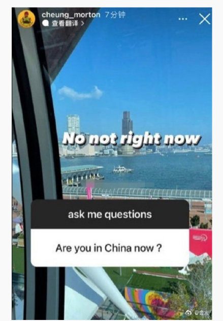 其中,当被问到:“Are You in China now?”(你目前在中国吗?)他则以英文写道:“No not right now”(目前不在),并发出一张在香港摩天轮拍的海港照片。