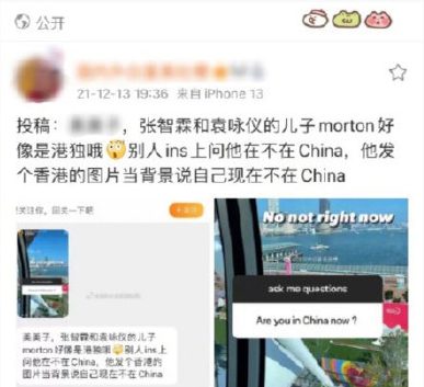 没想到,他的回答却引起部分中国网民不满,截图后发布在微博,质疑道:“张智霖和袁咏仪儿子Morton好像是港独哦,别人ig上问他在不在China,他发个香港图片当背景,说自己现在不在China。”