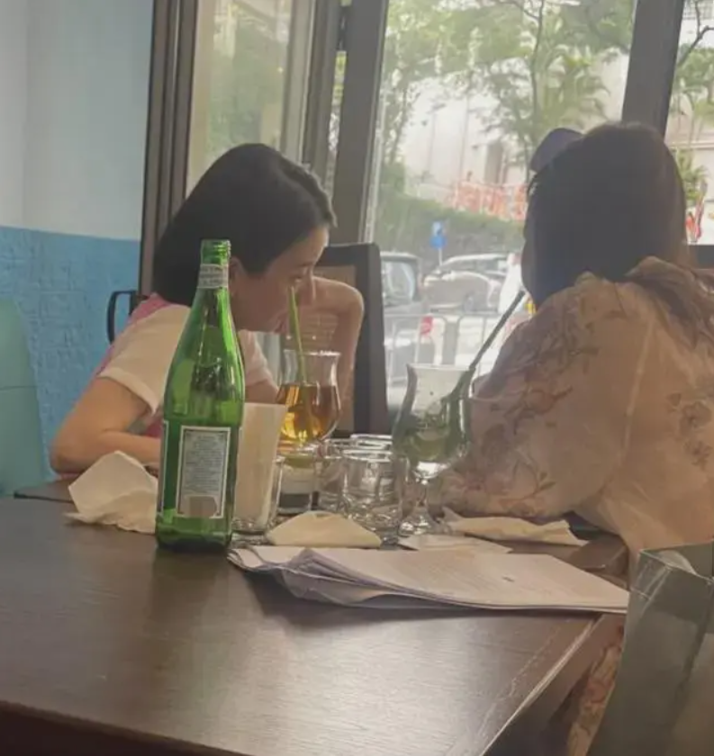 照片可见,方媛与女友人坐玻璃门旁边位置,餐桌上摆放着一堆文件,两人一脸严肃讨论,看似在商讨公事。