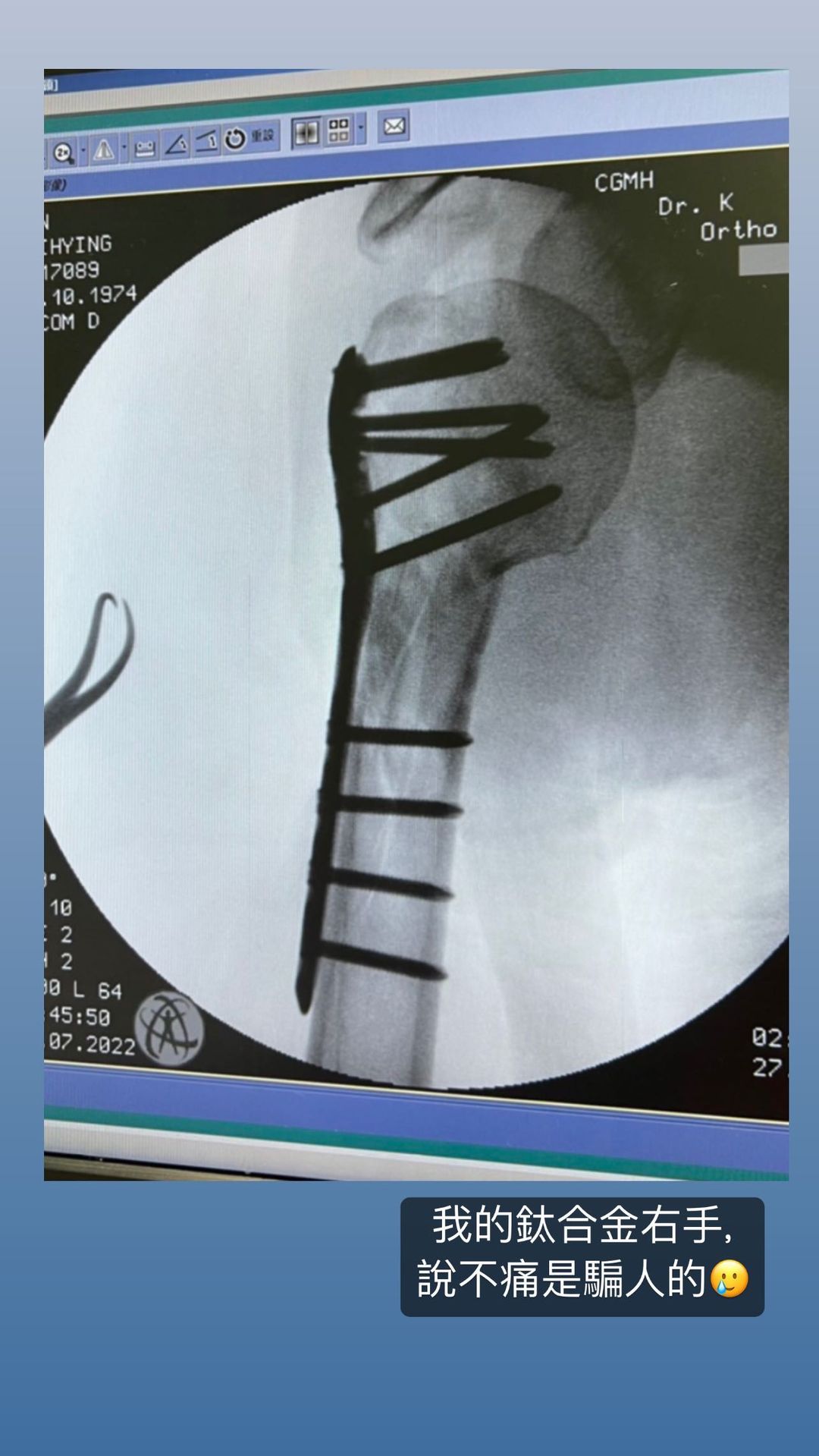 林志颖贴出X光片表示“钛合金手臂需要时间训练”,X光片中可见他的骨头中被植入钛合金固定,当初伤势严重程度可想而知。