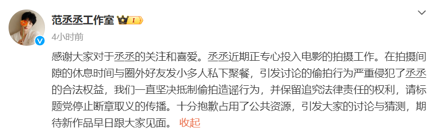 对于聚餐一事引起网民热议,范丞丞工作室在微博发文澄清,指他近期忙于电影拍摄,那只是休息时间和友人私下小聚时光,严重谴责、抵制偷拍造谣行为,并保留追究法律责任的权利。