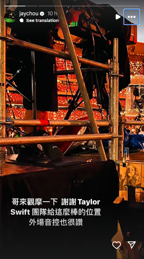 周杰伦说,这次座位是泰勒丝团队特别为夫妻俩安排的,自己平时只有在台下调整音控,“这次在这里直接听别人的演唱会,感受很特别”