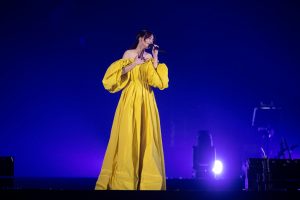 昨晚演唱会以《先知》拉开演唱会序幕,一身白色长裙搭配1.1公尺高巨型头饰,慢慢走上漂浮舞台,并升高到4公尺,与歌迷随歌声摇摆。