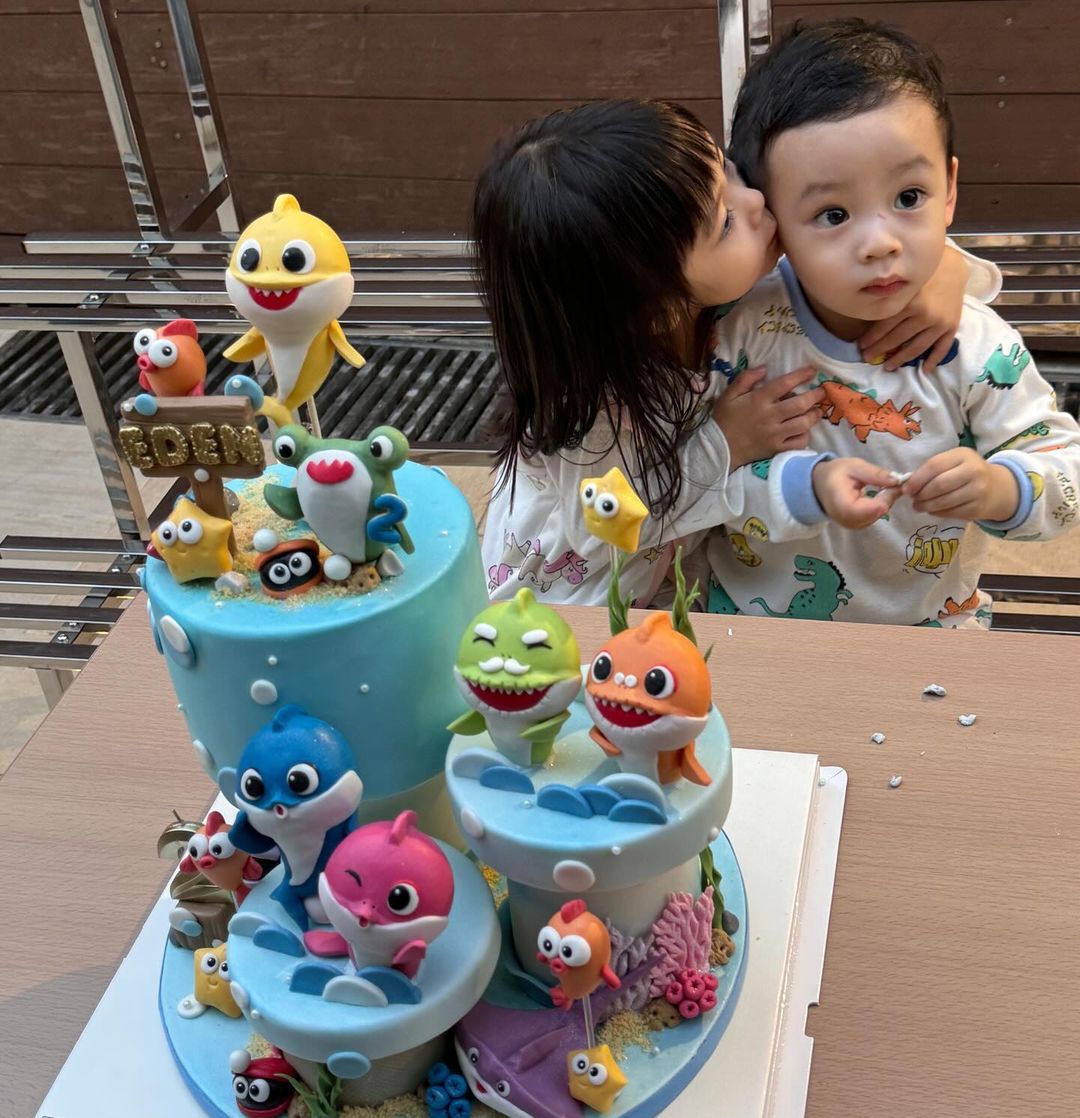 杨茜尧为儿子准备了一个卡通造型的蛋糕,而女儿则抱著弟弟,并轻吻对方,相当温馨,一家四口的高颜值,也意外成了亮点。