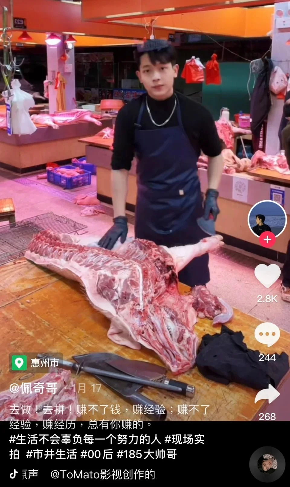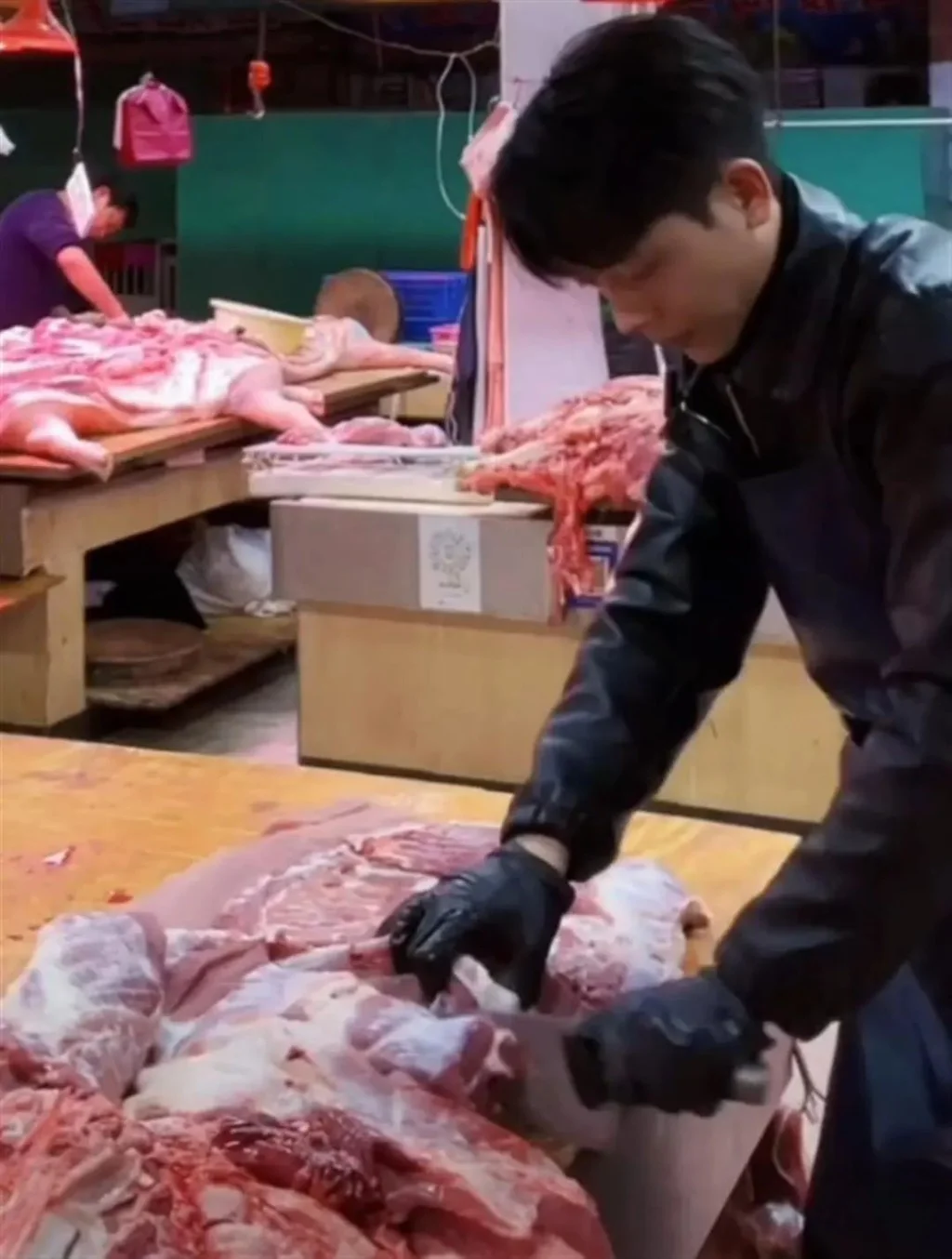 2022年夏天,他在社交媒体上分享了在猪肉摊位的工作日常,短短半年内吸引了10万粉丝。