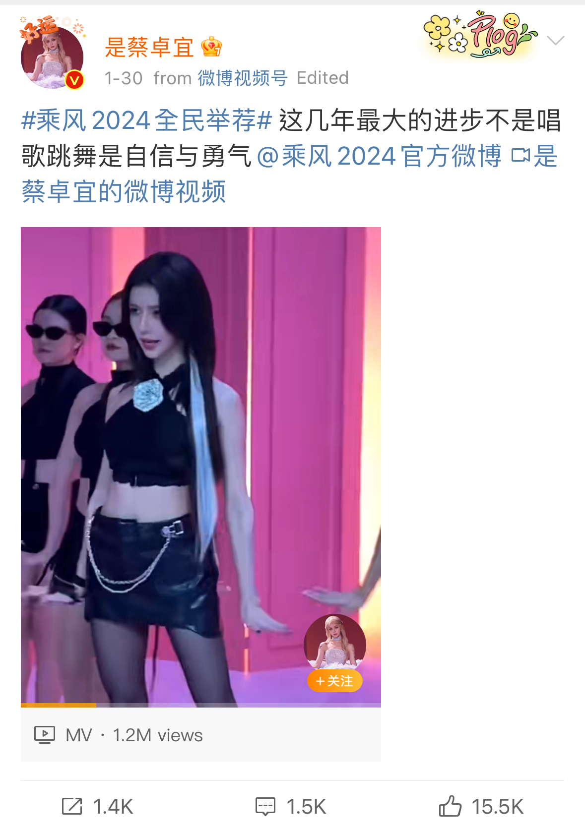 蔡卓宜微博上发布新歌《I Don’t Care》唱跳影片,并配文表示:“这几年最大进步不是唱歌跳舞,是自信与勇气”,然后,在贴文还标注了《乘风破浪2024》,以自荐参加征选。