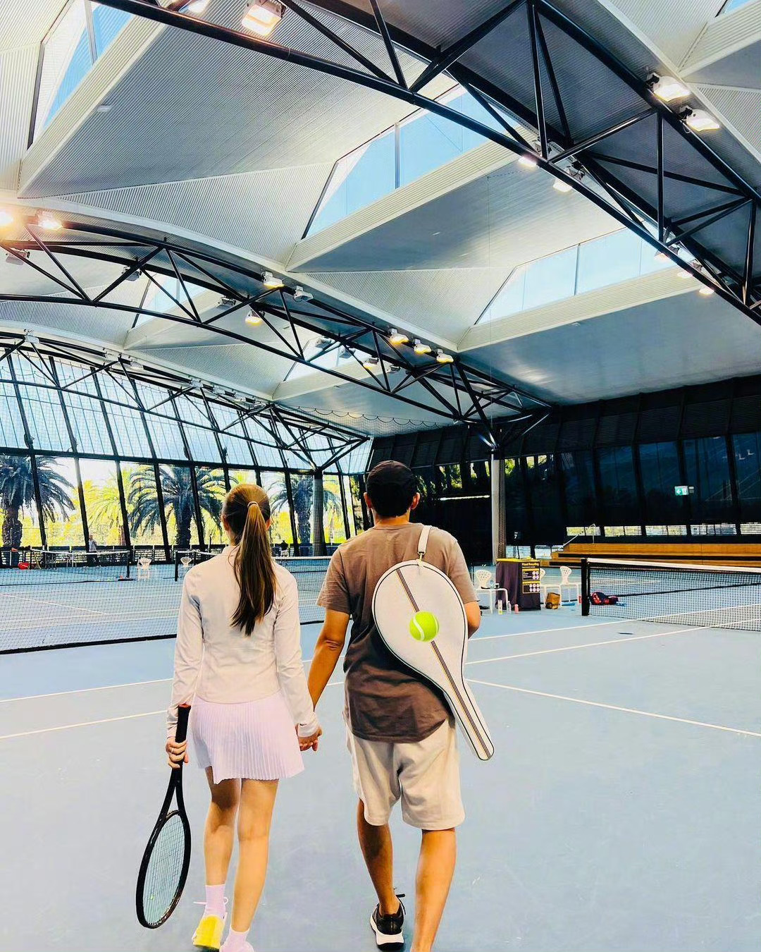 照片展现了两人手牵手的温馨背影。