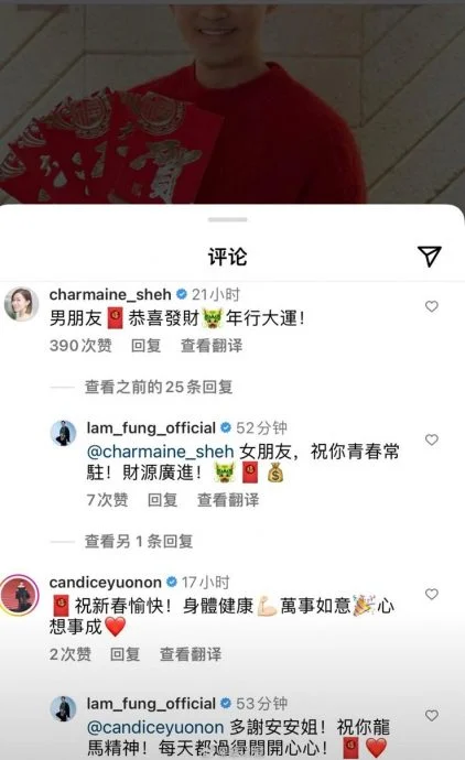 佘诗曼在好友林峰帖文下留言:“男朋友,恭喜发财,龙年行大运!”,而林峰则回复到:“女朋友,祝你青春常驻!财源广进!”。
