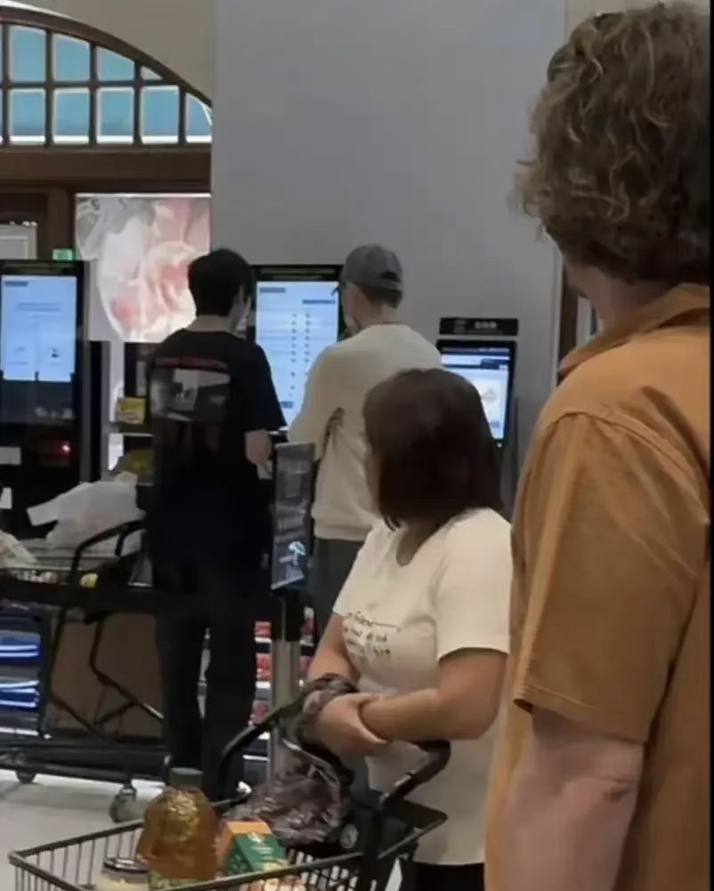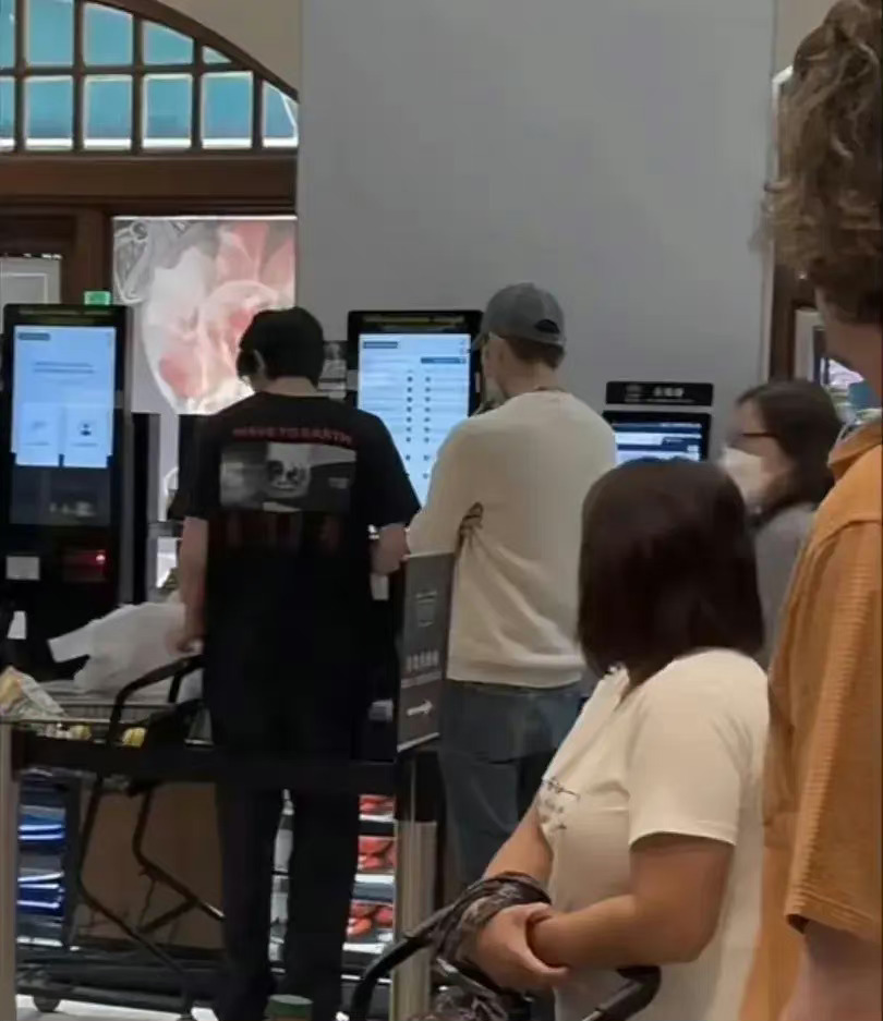 从照片看到张智霖身穿米色长袖线衫抱着胳膊,而张慕童身穿低调黑色T恤;父子俩在自助付款机前处理选购东西,其中儿子将食物放入白色塑料袋内,画面家常又温馨。