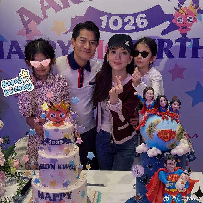郭富城的生日蛋糕以“超人一家”为主题,造型创意十足。方媛和两位女儿坐在地球上,郭富城屹立不倒站在前方,怀中抱着头戴蝴蝶结的“超人宝宝”,萌度爆表。