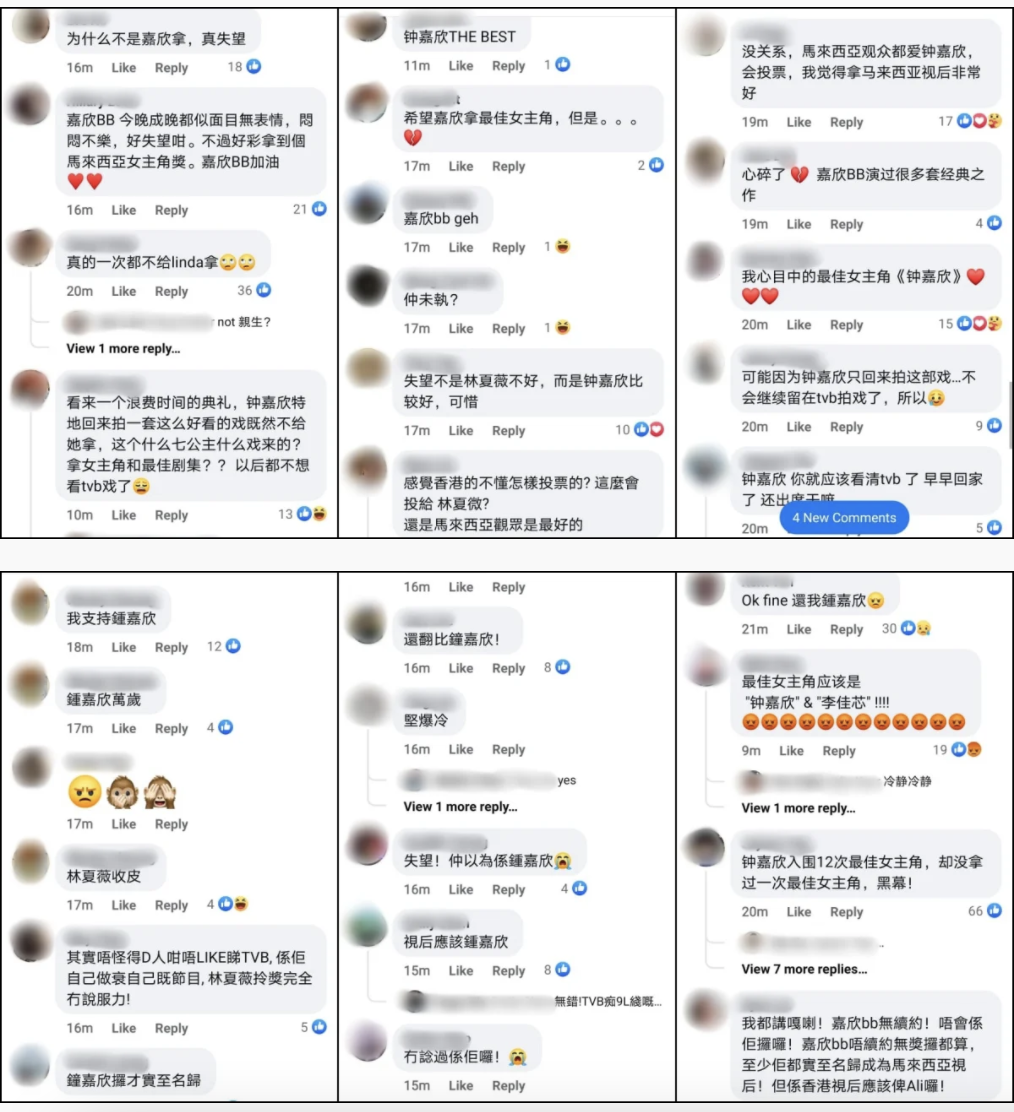 凭借《星空下的仁医》而成为视后大热门的钟嘉欣,在昨晚的颁奖典礼中夺得马来西亚最喜爱女角色,然而,视后最终落在了《七公主》林夏薇的手上,让钟嘉欣无缘双料视后,让许多网民纷纷留言声援。