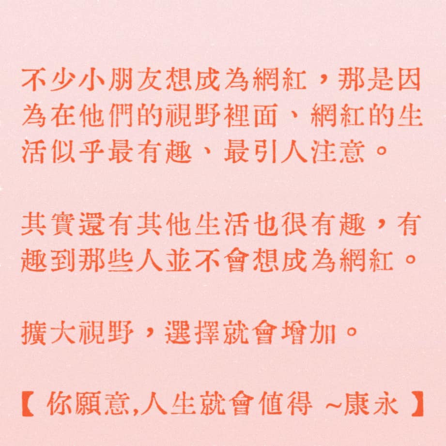 “其实还有其他生活也很有趣,有趣到那些人并不会想成为网红,扩大视野,选择就会增加;你愿意,人生就会值得。”