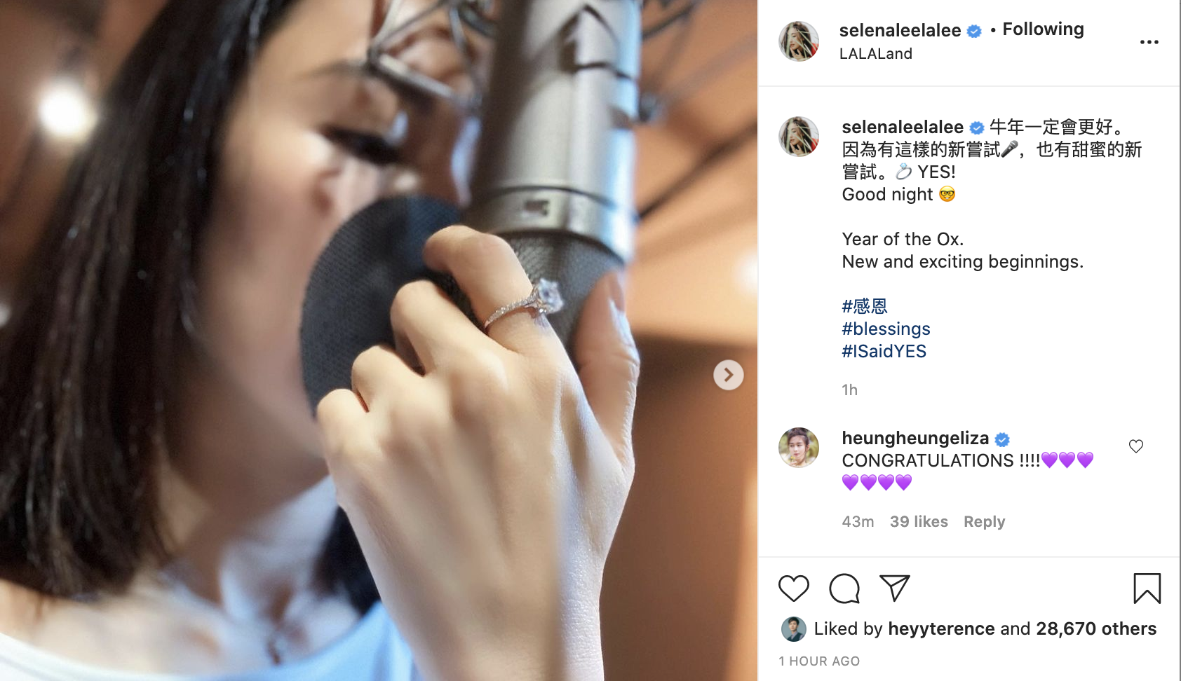 李施嬅在IG上写道:”牛年一定会更好。因为有这样的新尝试🎤 ,也有甜蜜的新尝试。💍Good night 🤓”她更#ISaidYES,似是被求婚成功,众星纷纷留言送祝福!