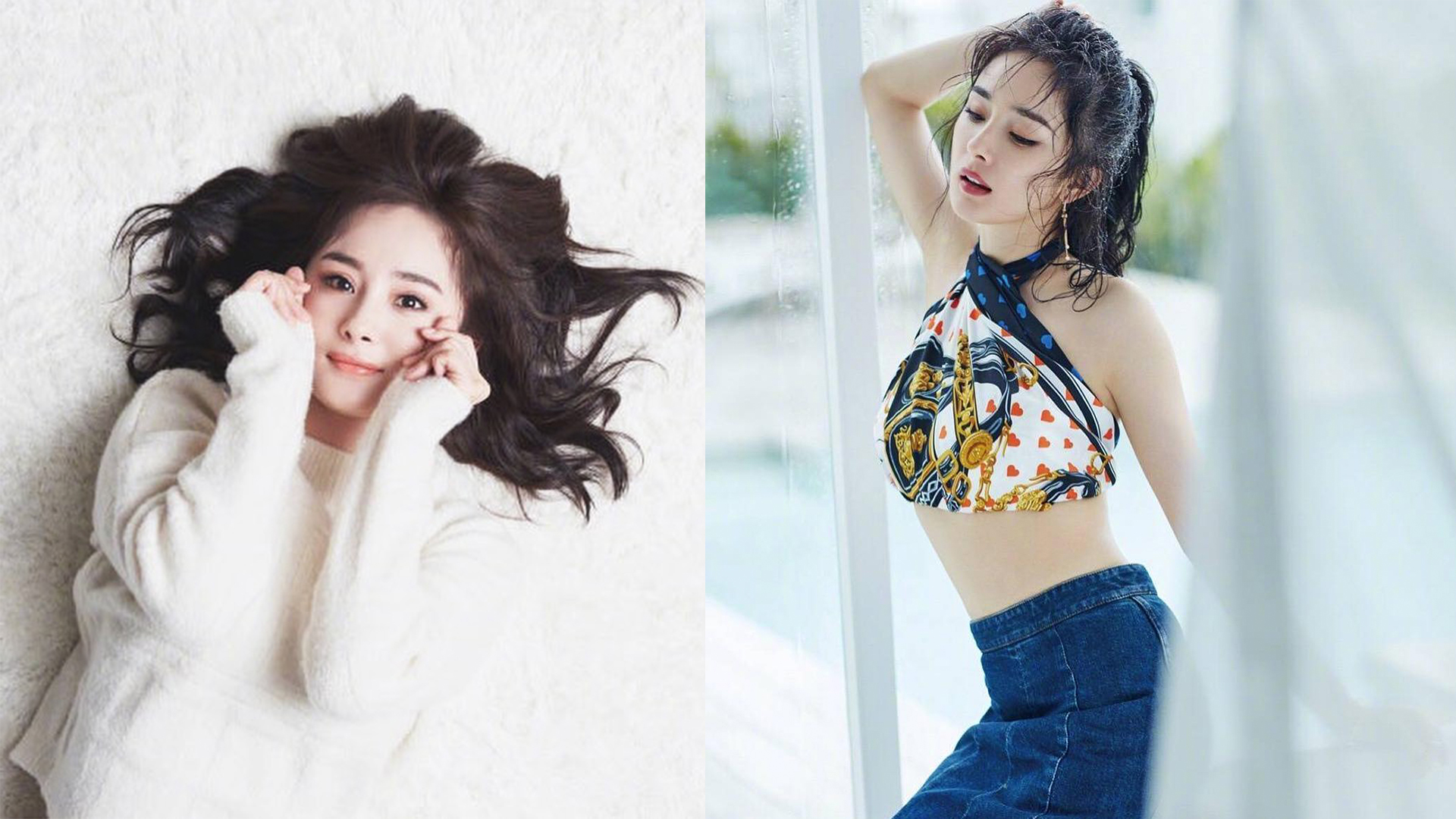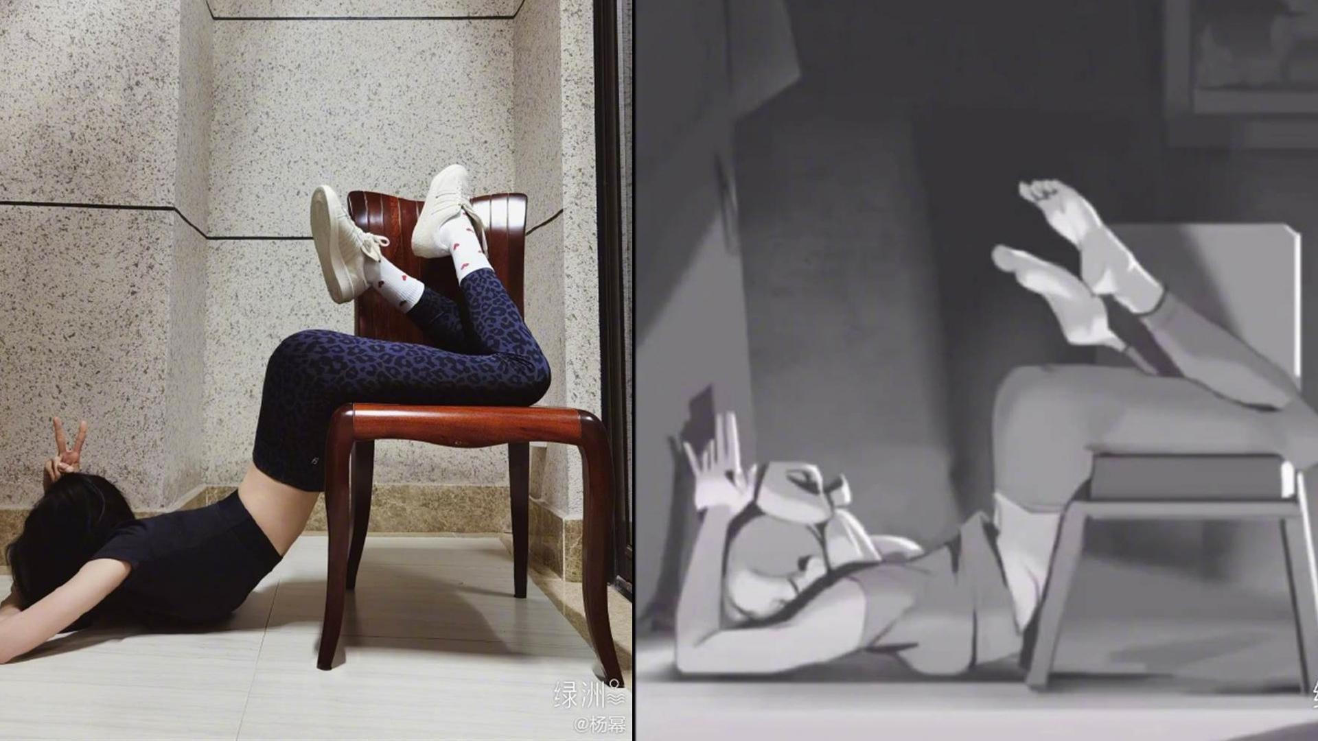 杨幂模仿漫画图片的姿势,上半身以趴姿平贴在地面、大腿则平放在椅子上,借由椅子和地板的高低差,呈现腰部纤细柔软的曲线。