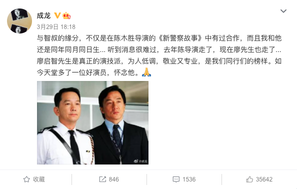 香港资深演员廖启智28日因胃癌与世长辞,突如其来的噩耗震惊外界,圈中的艺人好友纷纷发文悼念,国际武打巨星成龙日前也在微博上透露,自己与智叔同年同月同日生,大赞对方敬业的演技派,对其病逝消息大感难过。