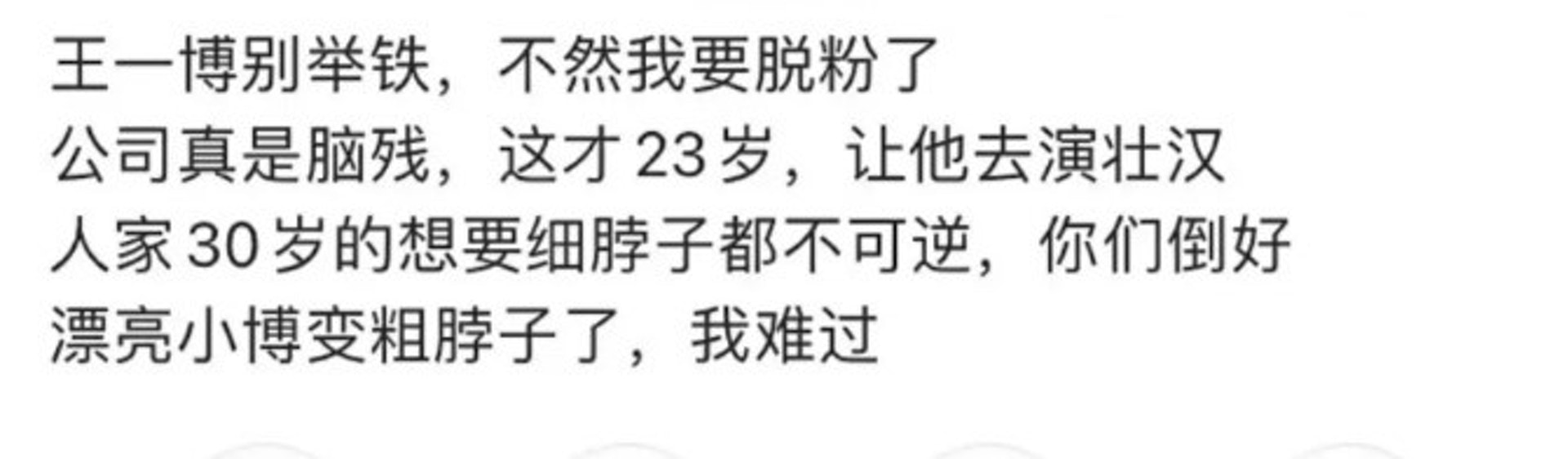 粉丝更是呼吁王一博不要再举铁,有者称直言王一博才23岁,经纪公司就让他演壮汉,控诉经纪公司是否要把他害死!