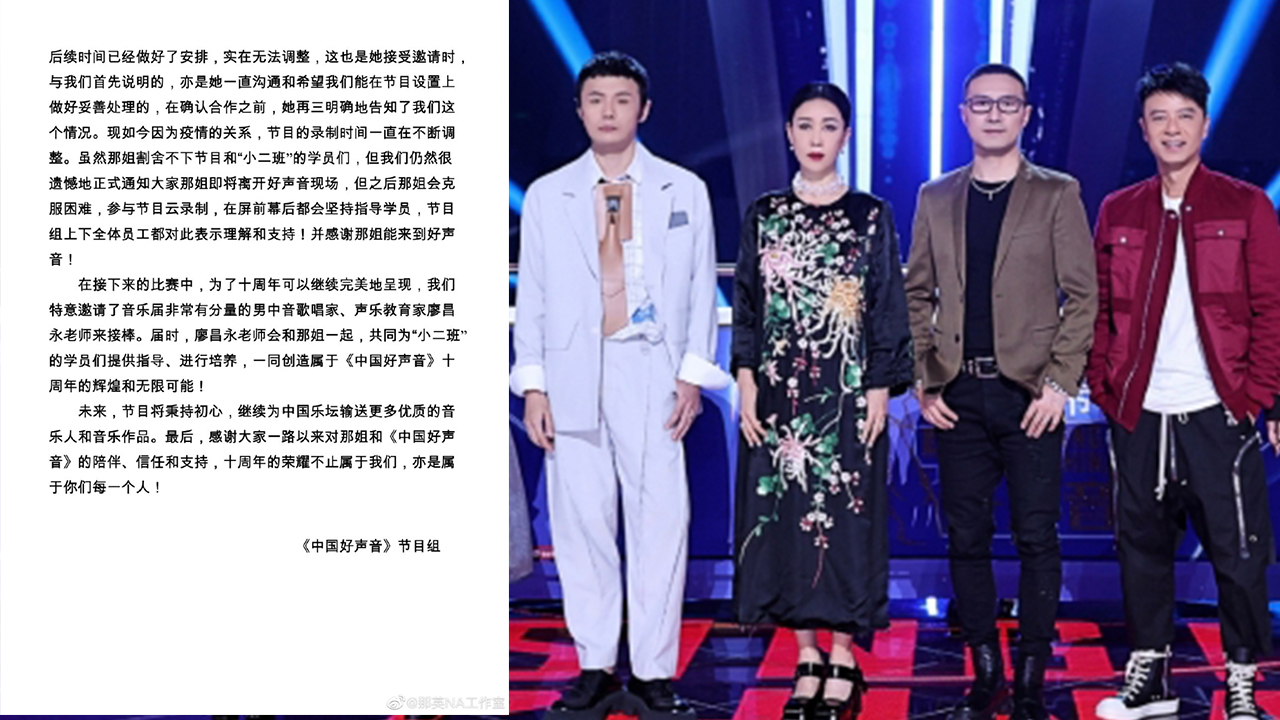 《中国好声音》节目组也在昨晚发表长文声明,证实那英有其他安排情况下,加上节目筹备过程因疫情发生变动,导致录影时间不断调整,那姐虽然答应回归,却只能参加盲选阶段。此次她无法走完全季,为了对学员负责,协助节目邀请知名的男中音廖昌永接棒,自己则以“云录制”的方式参与。
