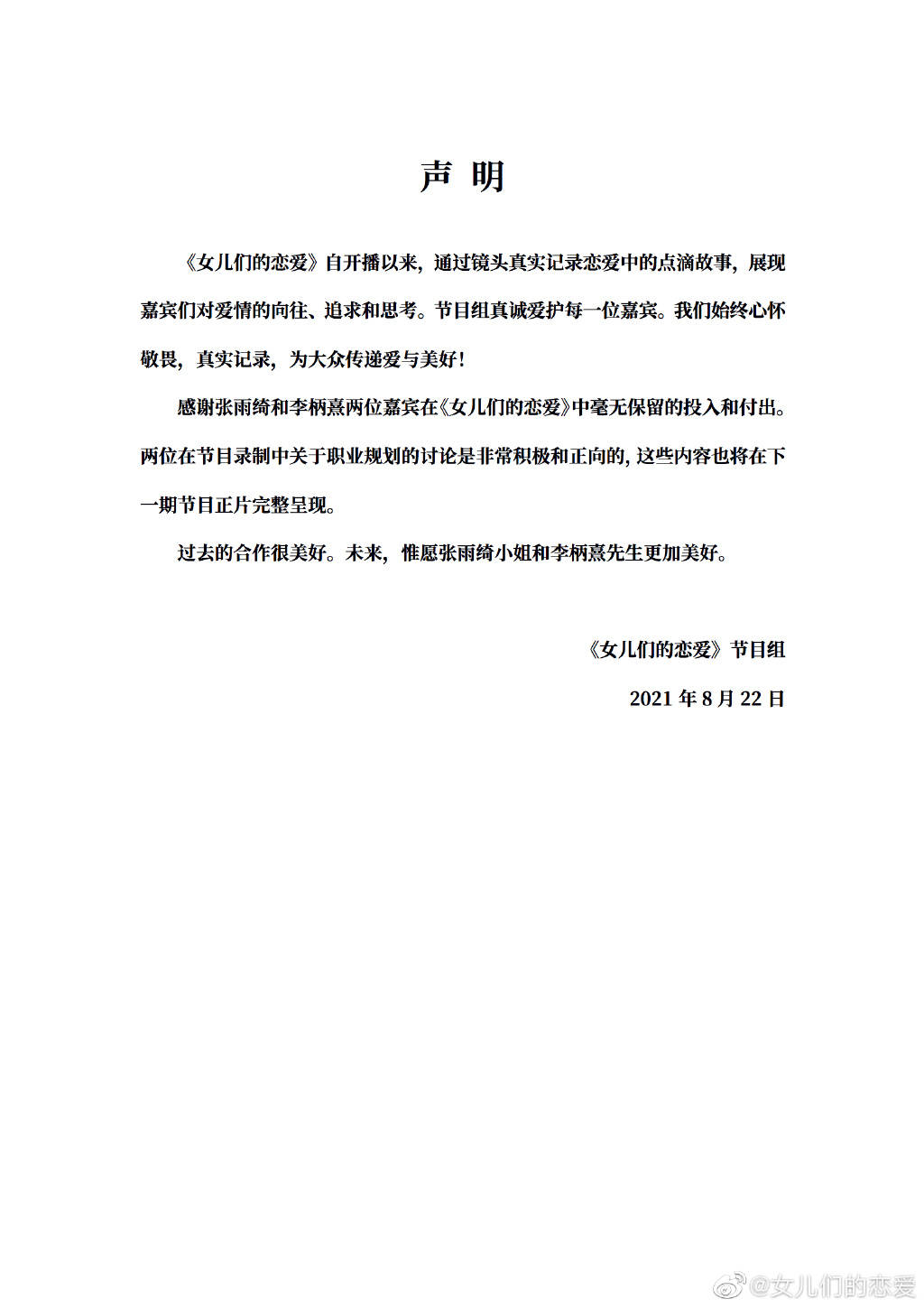 对此,芒果TV《女儿》节目组发布声明称,“感谢张雨绮和李柄熹两位嘉宾在《女儿们的恋爱》中毫无保留地投入和付出。两位在节目录制中关于职业规划的讨论是非常积极和正向的,这些内容也将在下一期节目正片完整呈现……过去的合作很美好。未来,唯愿张雨绮和李炳熹更加美好。”
