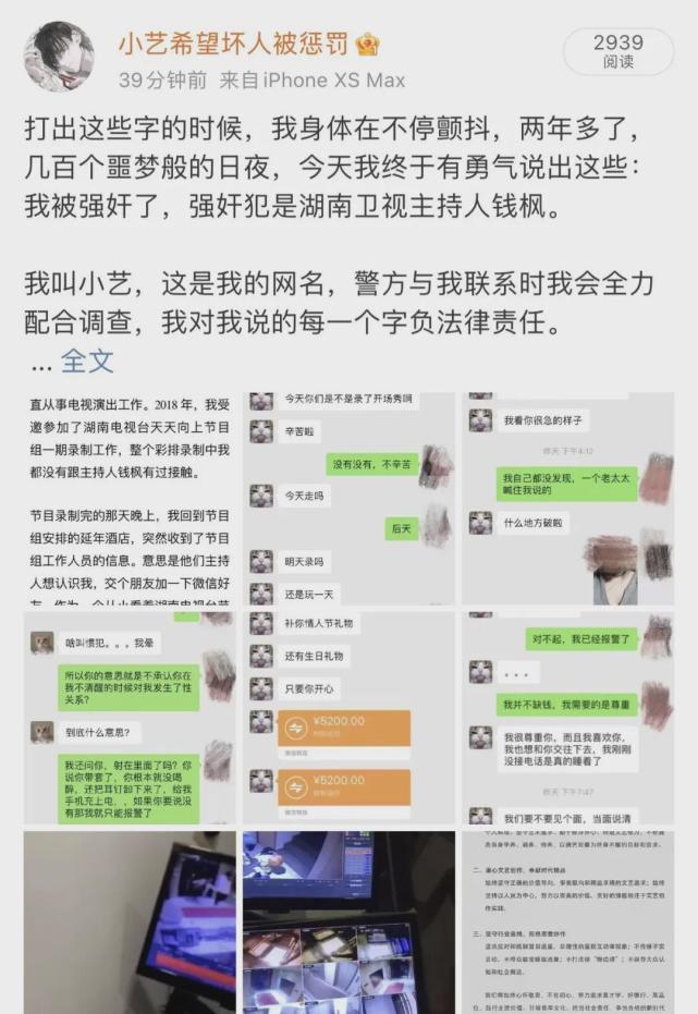这个化名“小艺希望坏人被惩罚”的网民日前于微博发文,透露自己从事电视相关工作,在2018年参与了《天天向上》某一集节目录制。当晚就收到工作人员讯息,说有位主持人想认识她,希望能加微信好友,小艺同意了请求,跟钱枫成为微信好友。