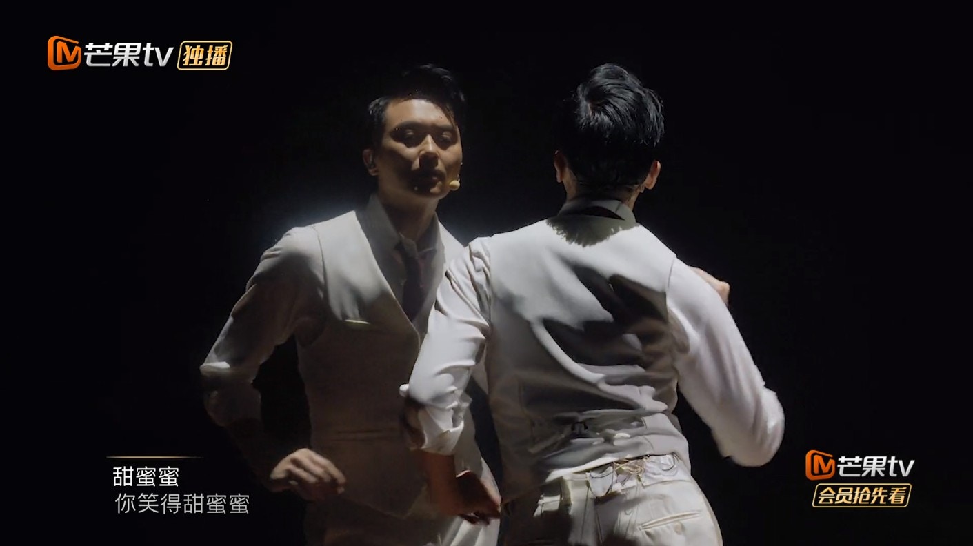 Chilam的独角戏部分,一身白色民国风格西装,温文儒雅,甚至有西关大少feel ,他对着玻璃屏陶醉跳起曼波舞,一举一动韵味十足,似足一个小剧场,令人忆起哥哥张国荣在电影《阿飞正传》中的一段独舞,非常感动。