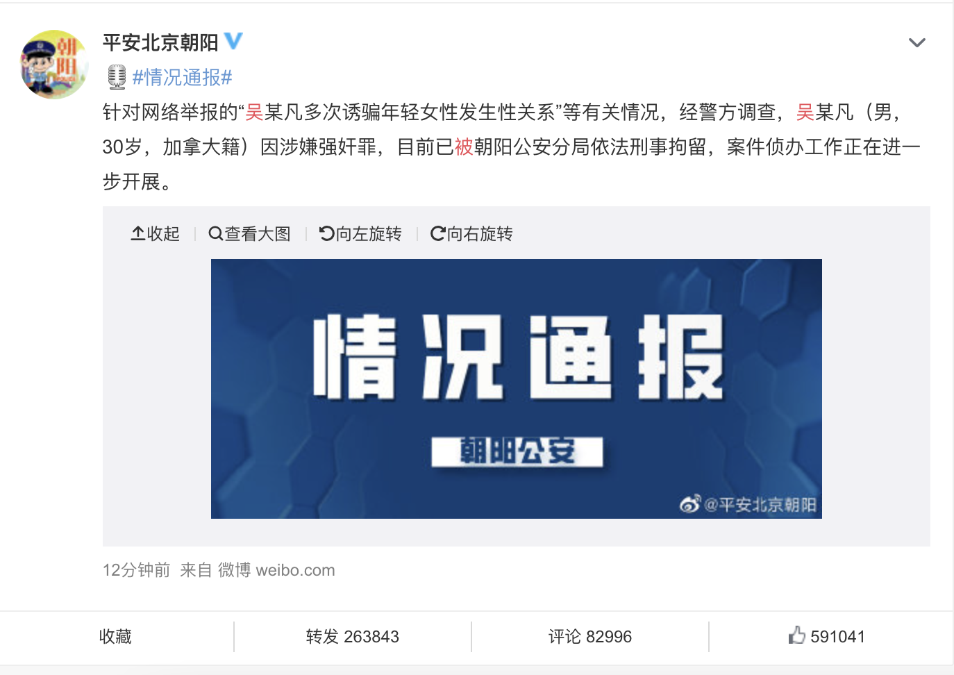 多家中国媒体报道,平安北京朝阳官方微博在7月31日晚上通报,针对网络举报的“吴某凡多次诱骗年轻女性发生性关系”等有关情况,经警方调查,吴某凡(男,30岁,加拿大籍)因涉嫌强奸罪,目前已被朝阳公安分局依法刑事拘留,案件侦办工作正在进一步开展。