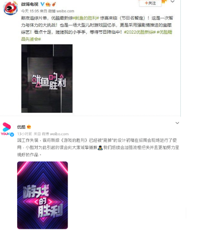 优酷在招商会上公布明年将会推出新综艺《鱿鱼的胜利》,规划为透过大型儿时游戏进行智力与体力的挑战,其综艺内容与《鱿鱼游戏》的剧情主轴极为相似,加上相关海报设计,也把《鱿鱼》的粉色圆形、三角形、正方形的符号融入字体,因此一曝光就引起议论,不仅韩国网友怒控抄袭,连大陆网友都讥:“脸都不要了!”