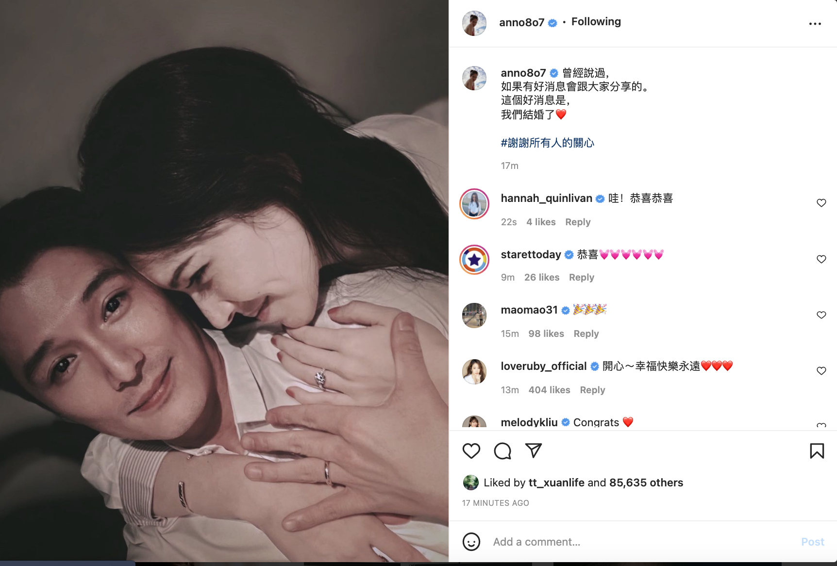 许玮甯在自己的IG上上载幸福拥着邱泽及晒出钻戒的照片,并写道:“曾经说过,如果有好消息会跟大家分享的。这个好消息是,我们结婚了。谢谢所有人关心。”