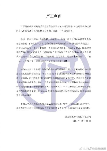 林俊杰工作室生声明,“若有人掌握林俊杰先生涉及违法犯罪的证据,敬请 向有关部门进行检举,林俊杰先生与本公司将积极配合有关部门的调查工作,以肃清谣言及无端指控。”