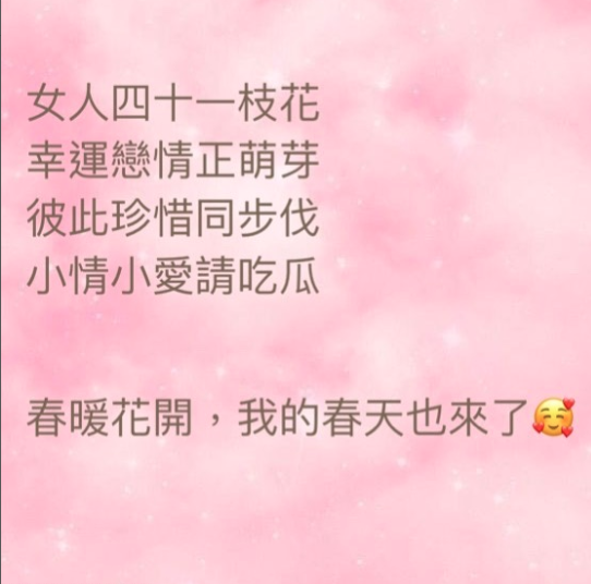 Selina(任家萱)日前被拍与一名年轻眼镜男亲密勾手约会,她像是热恋中的少女般蹦蹦跳跳,互动非常亲密,Selina对此亲自发文官宣恋情:“女人四十一枝花,幸运恋情正萌芽,彼此珍惜同步伐,小情小爱请吃瓜,春暖花开,我的春天也来了。”