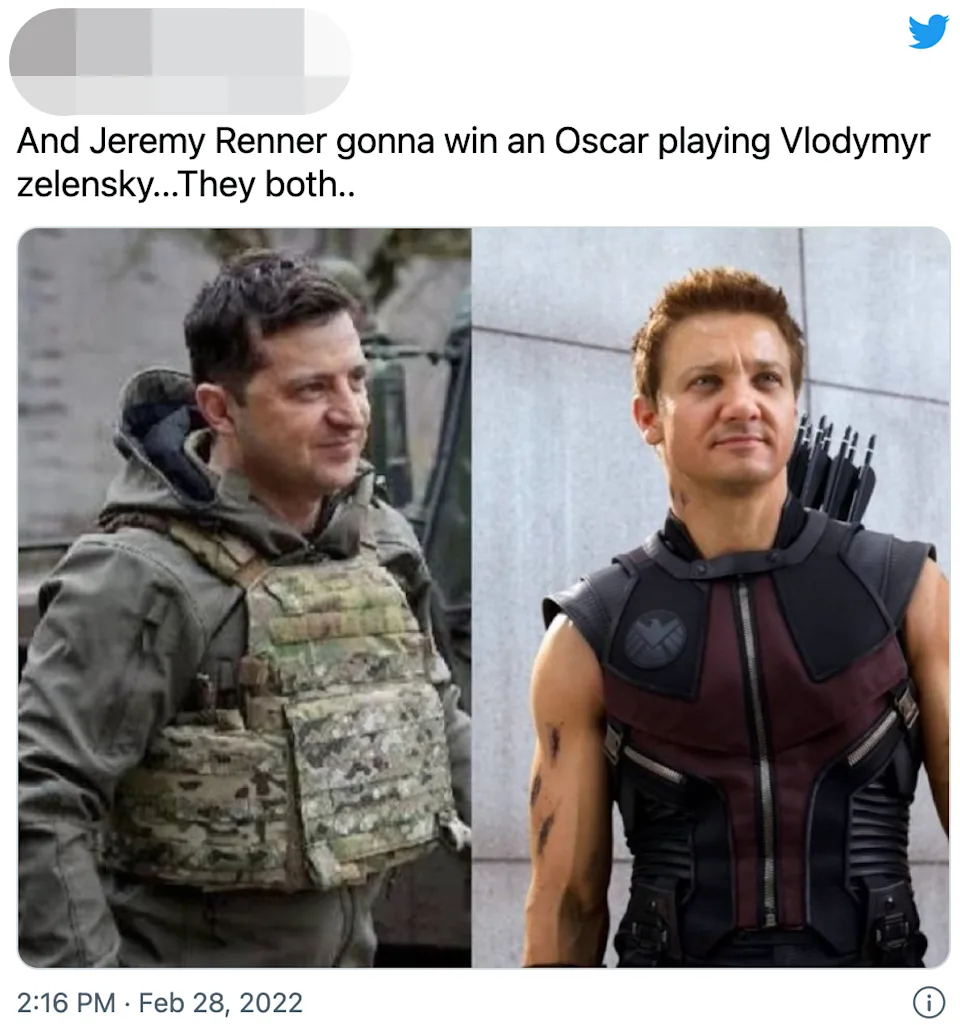 有推特网友突发奇想,把杰瑞米雷纳先前演出《危机倒数》(The Hurt Locker)剧照,和泽伦斯基穿着军服的模样摆在一起,可见两人的确很相似,这张创意拼图更是钓出了鹰眼本尊,他转发《纽约时报》所发布的泽伦斯基演说影片,间接献上支持,希望透过自身影响力为乌克兰发声,让更多国家、民众了解乌克兰目前所面临的困境。