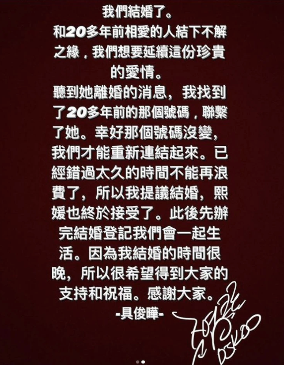 具俊晔表示“我们结婚了,和20多年前相爱的人结下不解之缘,我们想要延续这份珍贵的爱情。”
