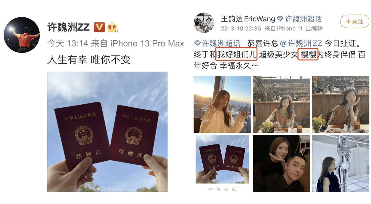 根据搜狐娱乐报道,许魏洲为了保护老婆,只晒出两人高举结婚证的照片,他过去一路来低调谈私事,鲜少人知道他有另一半,结果,王韵达的微博祝福却把许魏洲的老婆是谁“公告天下”,而王韵达更遭来网骂,指他蹭热度,让他最后不得不删帖。
