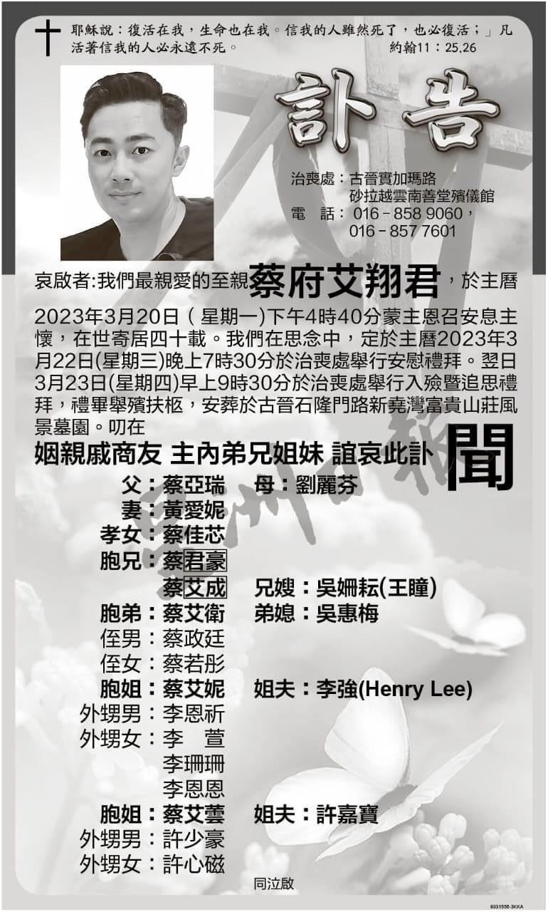 艾翔家属今日在报章刊登讣告,他是于本月20日(星期一)下午4时40分逝世,入殓暨追思礼将于23日早上9时30分在云南善堂殡仪馆举行。