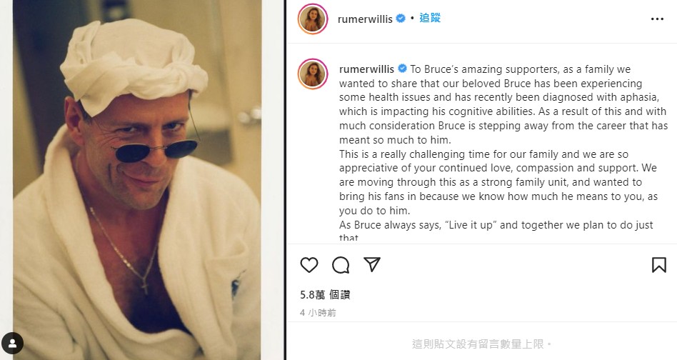 Bruce Willis的家人在IG发文,写道:“给所有布鲁斯的支持者们,身为家人的我们想分享,我们心爱的布鲁斯正经历健康问题,最近被诊断出患有失语症,这正影响他的认知能力。深思熟虑后,布鲁斯决定退出对他而言意义重大的职业。”