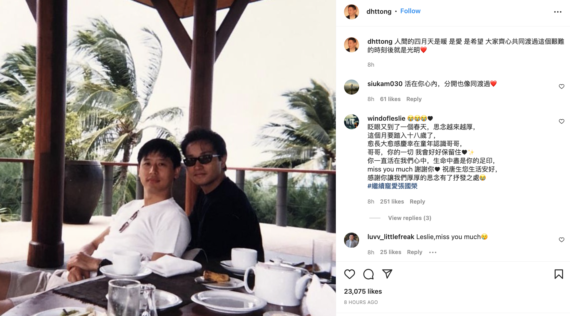 每年的4月1日,是香港超级巨星张国荣的死忌,今年是哥哥逝世19周年,其挚爱唐唐——唐鹤德一如既往发合照缅怀张国荣,也唤起不少艺人明星及影迷共同缅怀这位已故的天王巨星。