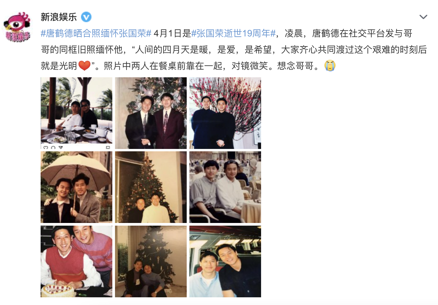 《新浪娱乐》报道,4月1日是张国荣逝世19周年,唐鹤德凌晨在社交平台发与哥哥的同框旧照缅怀他,唐唐还引用了林徽因的《你是人间的四月天》诗句发文:“人间的四月天是暖,是爱,是希望,大家齐心共同渡过这个艰难的时刻后就是光明”。
