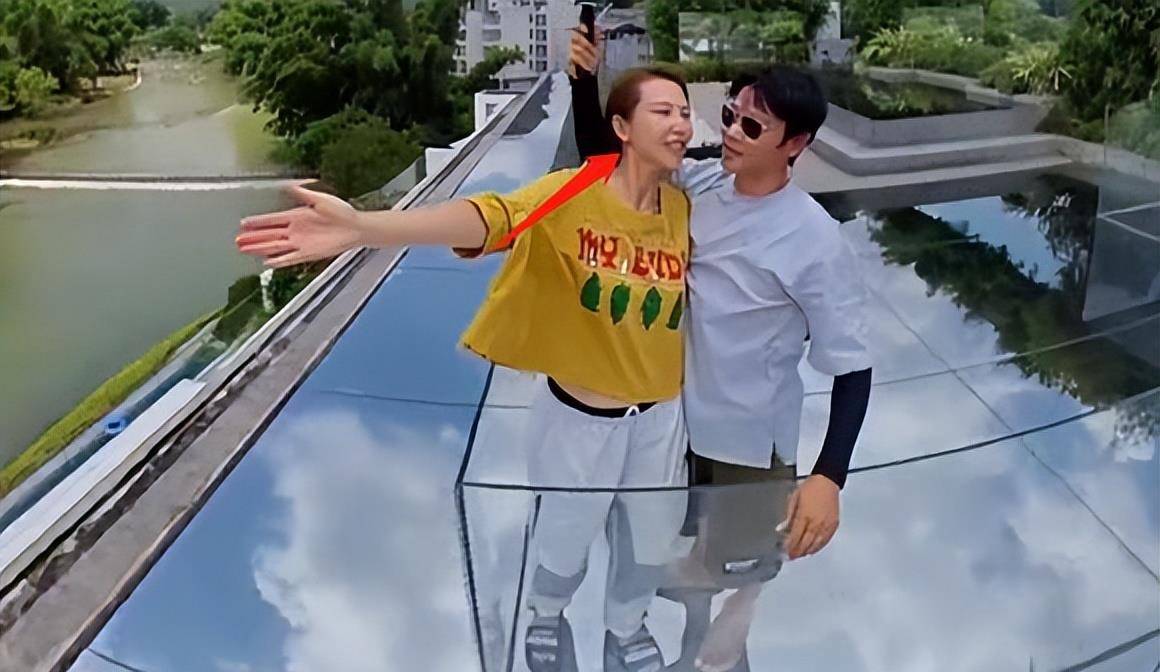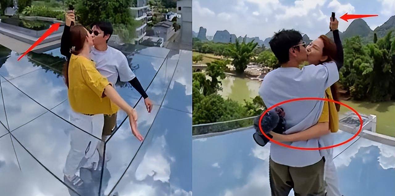 画面中蔡少芬将头发扎起放于身后,穿着黄色T恤配白色长裤,十分地休闲舒服,是旅游必备穿搭。沉浸在游玩享受美景的两人,也学着年轻人站在玻璃桥上拍照,只见蔡少芬在享受完四周美景后,满脸笑容还没退却,便与张晋搂腰热吻。