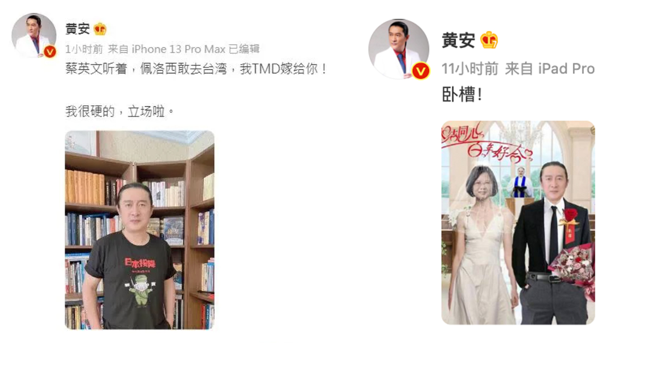 台湾媒体报道,黄安始终不相信裴洛西会来,甚至搬出《推背图》来佐证:“蔡英文听着,佩洛西敢去台湾,我TMD嫁给你!我很硬的,立场啦”,结果惨遭重重的打脸,唯有自己转发自己被恶搞的“与蔡总统结婚合成照”,并撰写:卧槽!来自我调侃。