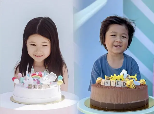 Kelly和Jared各自都拥有一个生日蛋糕,上面还有两人的名字;Kelly满脸婴儿肥,肌肤白皙可人,神似爸爸,弟弟Jared笑出酒窝,长得越来越像妈妈。