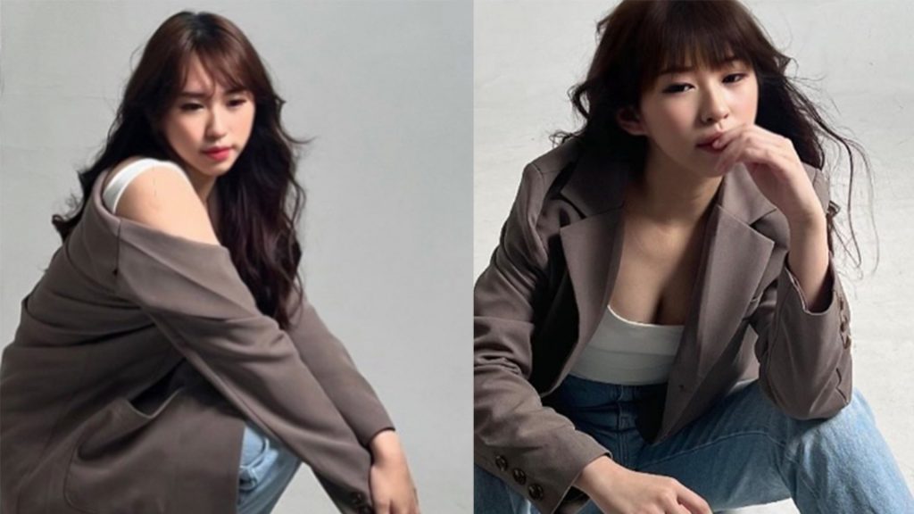 照片中,只见“小玫瑰”穿着一件咖啡色的西装外套搭配白色文胸上衣与牛仔裤,另一张则直接坐在地上的正面照片,却以由上往下的角度拍摄,展现性感女人味。