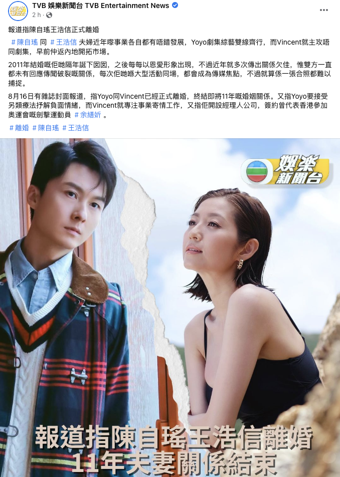 此外,TVB娱乐新闻台脸书专页,也报道两人被传婚变的消息。